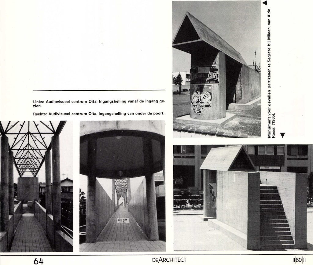 Zelfs Kenzo Tange die aanvankelijk toch de door Isozaki na 1963 ingeslagen weg niet direkt kon begrijpen, speelt in zijn onlangs (1978) gerealiseerde tweede Sogetsu artcentre in Tokyo met het spiegelend glas, de grote verticale spleet en de kleine horizontale band die het John Hancock building in Boston in één keer beroemd maakten (architect leo Ming Pei, 1976). Al dit citeren sluit niet uit dat men telkens tot een nieuwe synthese komt waarin de citaten op harmonieuze wijze verwerkt worden. Het audiovisueel centrum in Oita is zonder voorkennis te waarderen als een prachtig gebouw. Met kennis van de ontwerpprocedure is het bovendien een uiterst interessant gebouw.
