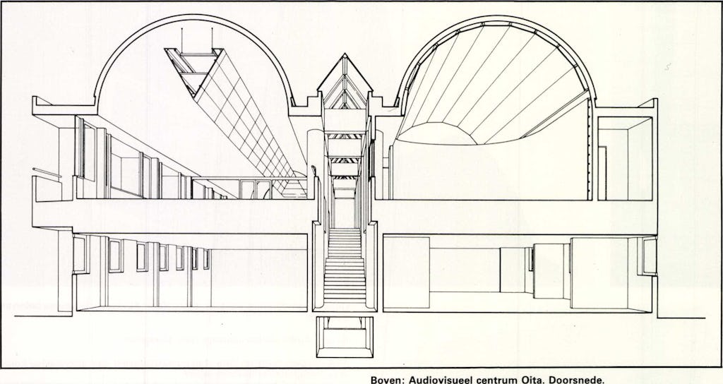 De nu ontstane doorsnede van het gebouw met twee halve cilinders langs een tussenzone komt eveneens voor in onderdelen van Isozaki's Fujimi golfclub en in de Kitakyushu Library. Niet zonder enthousiasme echter verwijst hij hier naar het Kimbell Art Museum in Fort Worth, Texas, van Louis Kahn uit 1966/'72. Evenals in Oita bevinden zich ook daar de verkeersruimten in de zone tussen de gewelven. De trappen van beide gebouwen naast elkaar gezet laten iets van de overeenkomst zien.