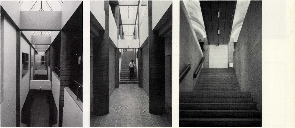 (R) Kimbell art museum. Fort Worth, Texas. Louis Kahn 1966- 1972. Trap in de zóne tussen twee tongewelven.