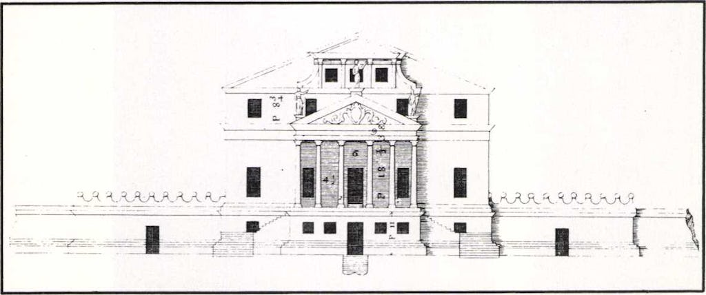 De symmetrisch geplaatste vluchttrappen in de voorgevel roepen allerlei historische voorbeelden in herinnering, in het bijzonder weer Palladio's villa Foscari/Malcontenta.
