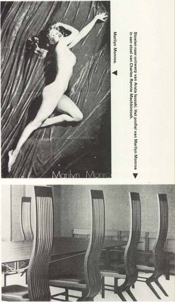 Isozaki spreekt bij deze vormen over de 'Marilyn Monroecurve' en zegt deze te ontlenen aan de beroemde foto van Marilyn in een nummer van Playboy uit de jaren '50. Op die foto ligt zij weelderig uitgespreid op een lap rode stof in een krachtige diagonale compositie, het linkerbeen opgetrokken. Door deze figuur liet Isozaki zich inspireren voor ontwerpen van vrije grafiek, van stoelen en delen van plattegronden. Met een ruim gevoel voor humor breekt hij op die manier het rigoureuze karakter van veel van zijn strikt geometrische werk op een wijze die herinnert aan Japanse tuinen.