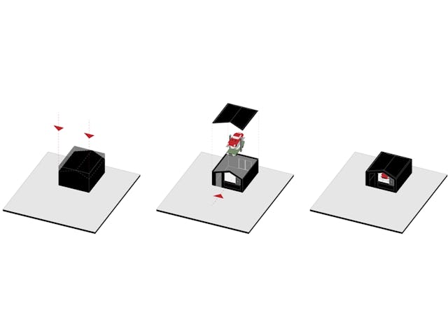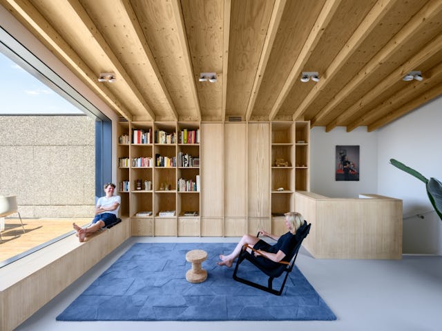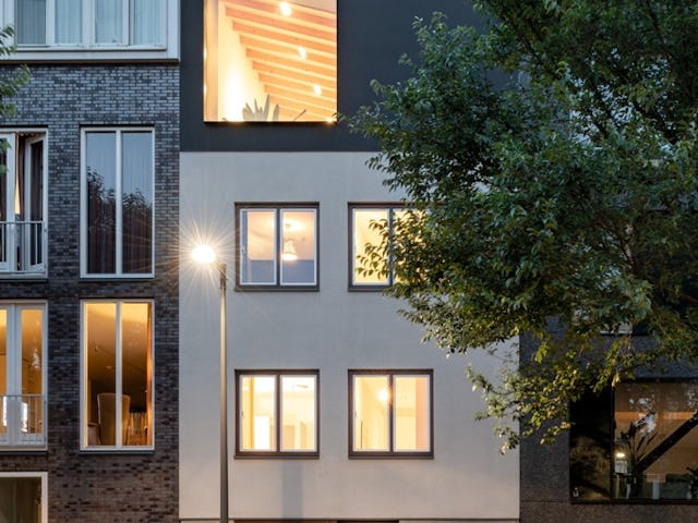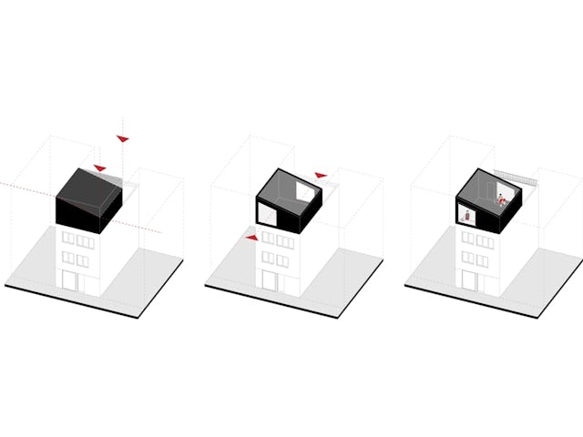 Naast de showroom ontwierp Bureau Fraai ook een bijpassende zwarte dakopbouw die aansluit op de verschillende dakhoogtes van de twee aangrenzende panden. Ook hier wordt zowel aan de voor- als achterzijde het interieur van deze woon- en werkruimte ingelijst middels een groot raam met stalen kader. Dit resulteert in een bijna Edward Hopper-achtige uitstraling vanaf de straat. Beide raamkozijnen hebben daarnaast ook een tweede functie. Het kader aan de voorzijde wordt in het interieur verlengd tot een bureau waarbij deze tegelijkertijd het uitzicht naar de buurt inkadert. Aan de achterzijde sluit het kader binnen aan op een bank die tegelijk onderdeel is van het wandmeubel.