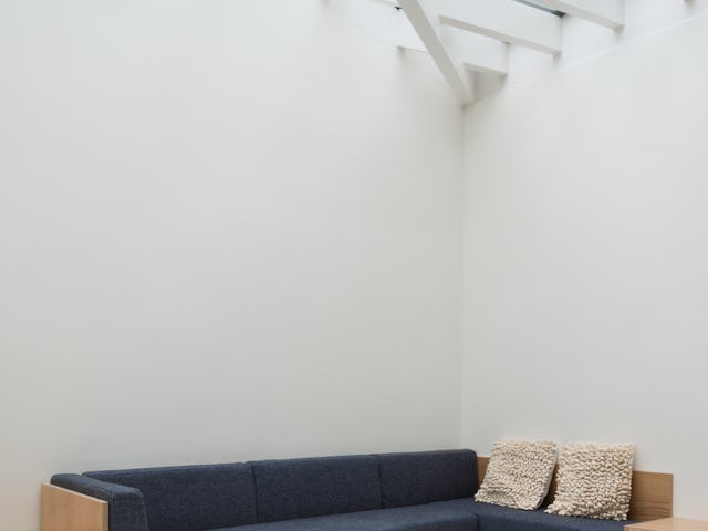 In de nieuwe ruimte onder het vlinderdak is een in eiken afgewerkt zitmeubel op maat ontworpen. Hierdoor ontstaat een comfortabele en lichte verblijfsruimte dichtbij de nieuwe keuken.