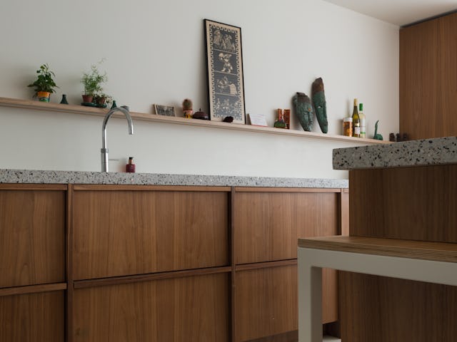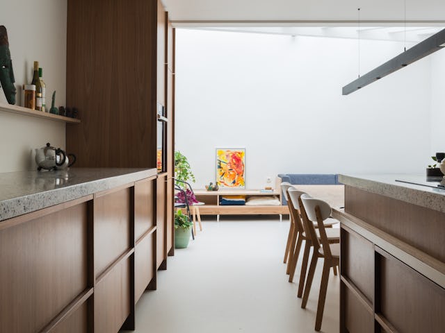 De nieuwe walnoot houten keuken is in dit ontwerp ook op maat gemaakt. In het midden van de keuken is een kookeiland ontworpen dat tegelijkertijd een eettafel is. Deze in warm eiken afgewerkte eettafel is het hart van de ruimte en draagt samen met het nieuwe zitgedeelte bij tot een prettige verblijfsruimte en een geschikte plek voor het gezin. Ook kan de tafel overdag als fijne werkplek worden gebruikt. De parelmoeren terazzo afwerking van het keukenblad geeft de keuken een zeer morderne uitstraling.