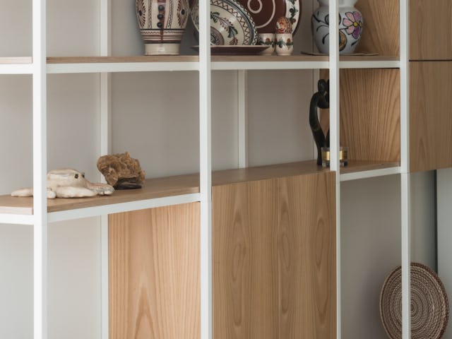 Voor extra opbergruimte in de keuken is een lostaande staal frame, eiken afgewerkte keukenkast ontworpen. Doordat dit meubel dezelfde materialisatie heeft als de keukentafel en het zitmeubel, vormt het meubilair één geheel en krijgt de totale ruimte een warme uitstraling.