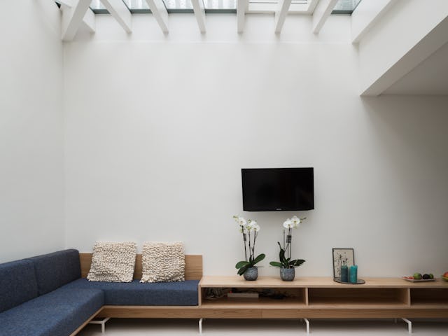 Het vlinderdak en meubilair op maat dragen zo dus bij aan een geslaagde uitbouw. De ontwerpfocus is hier overduidelijk niet gelegd op het creëren van enkel extra vierkante meters, maar op persoonlijk gebruiksgemak, behaaglijkheid en comfort van de ruimte.