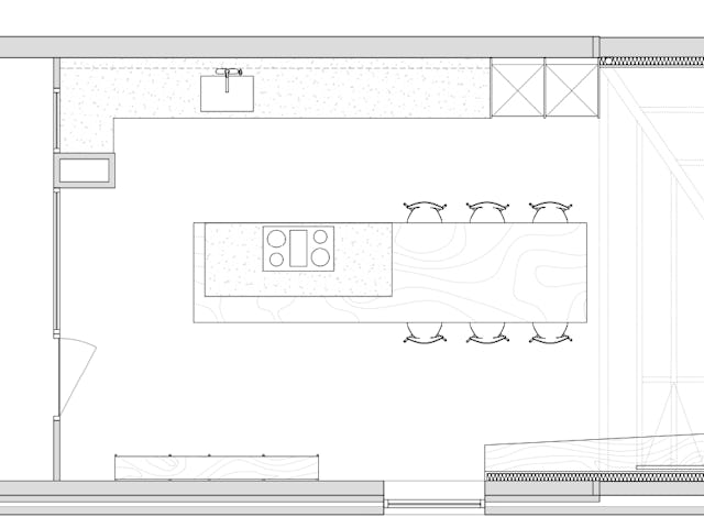 Om de nieuwe eet- en verblijfsruimte toegankelijk te maken, is ook het oorspronkelijke scheidingselement tussen keuken en verkeersruimte vervangen. Het nieuwe scheidingselement is door het toevoegen van ramen veel transparanter geworden. Dit draagt bij aan de ruimtelijkheid van de nieuwe keuken de relatie tussen de voor- en achterruimtes op de eerste verdieping. Om deze ruimtelijkheid te versterken is boven het kookeiland een langwerpige lamp opgehangen in de lengterichting van de ruimte. Ook de cacao-kleurige Forba marmoleumvloer draagt bij aan de beleving van de ruimte als één geheel.