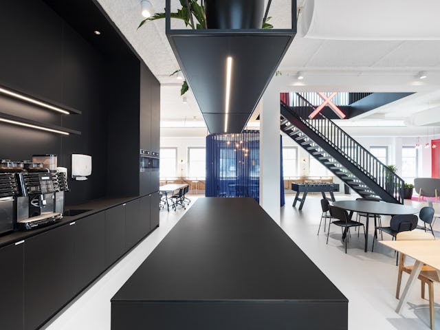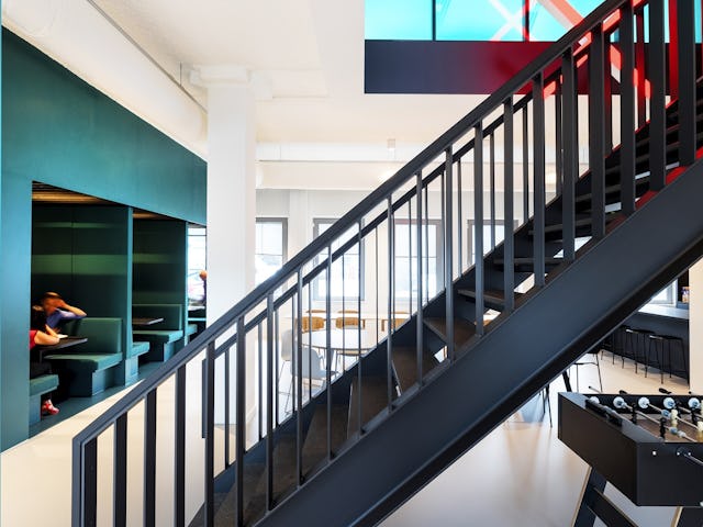De trap zo ontworpen dat deze uitnodigt tot bewegen en de bovenverdiepingen ontsluit. Een enkele kantoorverdieping onderscheidt zich door het stoere, centraal geplaatste blok waarin verschillende vergaderruimtes zijn opgenomen. Rondom dit blok zijn ook verscheidene