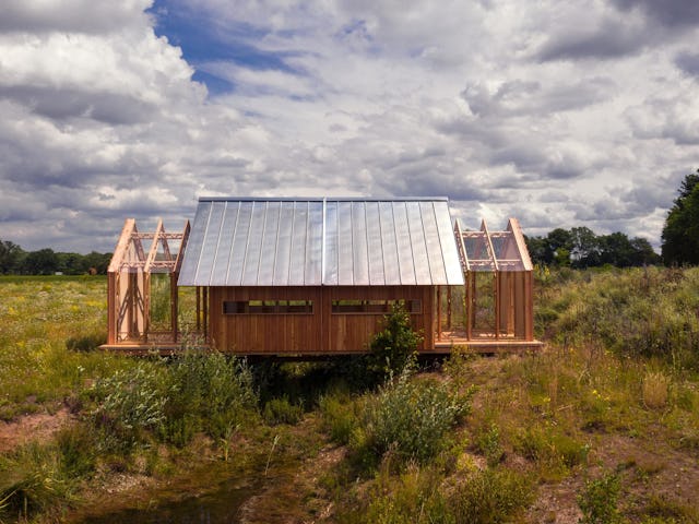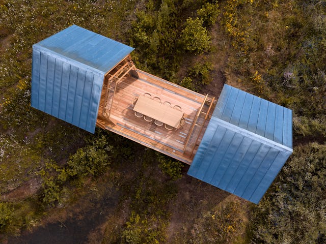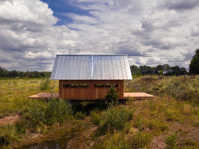 Het idee van Cabin ANNA is ontstaan vanuit een verlangen om samen mét de natuurlijke elementen te leven in plaats van volledige afscherming hiervan. “Eigenlijk gaat het vooral om het buiten zijn. Het creëren van de verbinding tussen huis, mens en natuur.” Het huis heeft twee verschillende ‘hulzen’ als buitenmuren, steunend op rails. De binnenmuur bestaat uit een raamwerk van hout en glas en is gescheiden van de houten buitenmuur met dak. Door de hulzen te verschuiven, zijn verschillende opstellingen mogelijk. “Zoals je je kleding aanpast aan het weer, je stemming of de gelegenheid.”, vervolgt Schols.