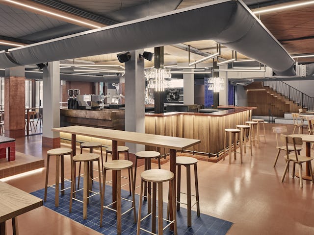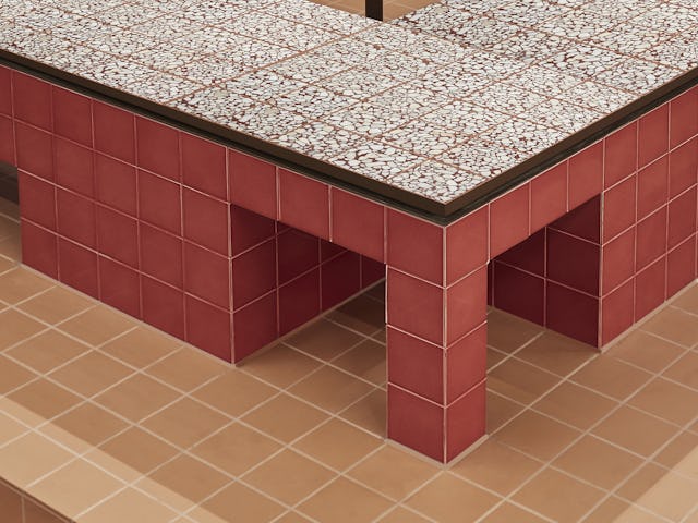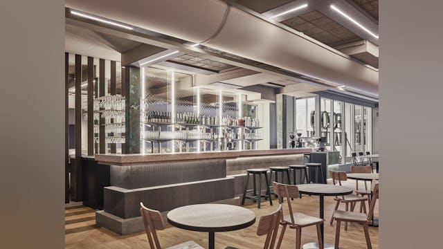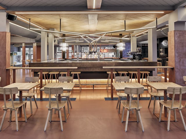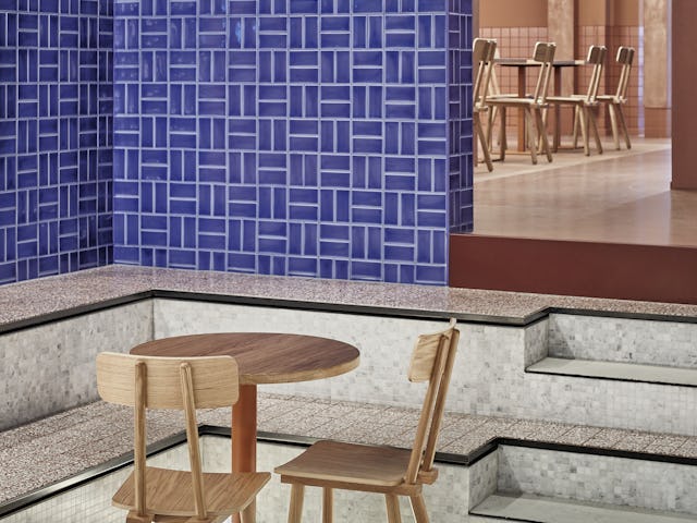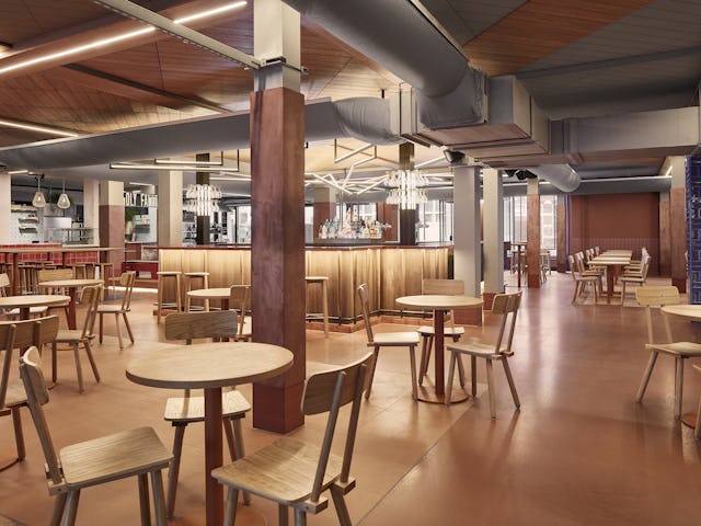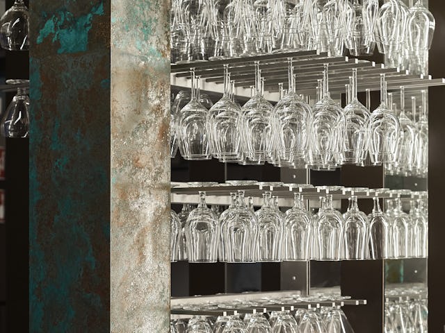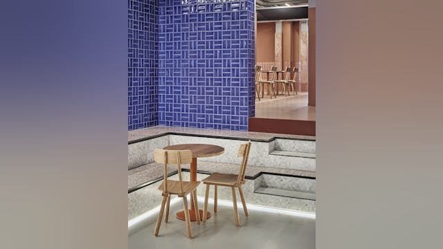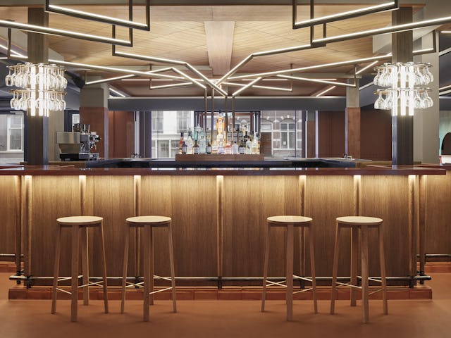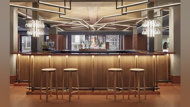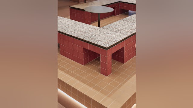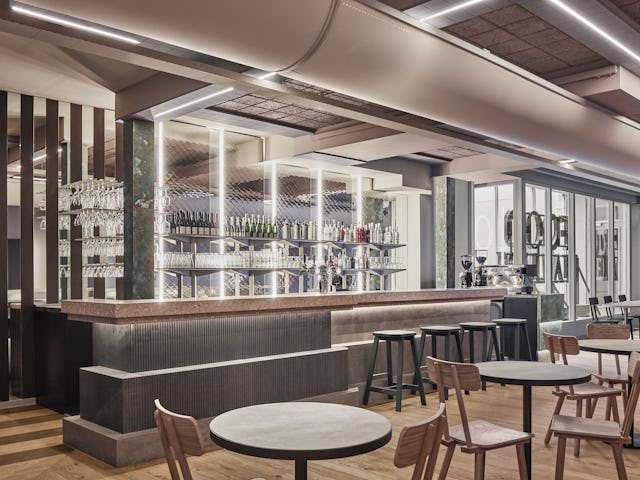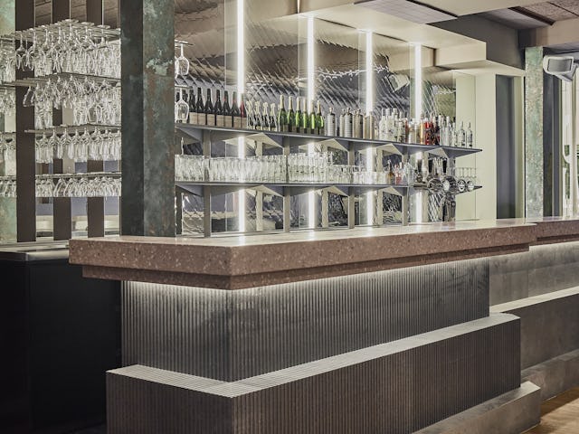 Een centraal geplaatste bar, verdeeld in twee delen, kijkt uit op de ingangen. Een meer intieme cocktailbar bevindt zich aan de andere kant. Beiden zijn afgewerkt met brons, rood marmer en terracotta tegels die overgaan in de vloer en plinten van de kolommen. De kolommen verwijzen naar bestratingspatronen die worden gebruikt op stedelijke pleinen. Verschillende maten en kleuren geven de niveaus van het interieur weer. Op maat gemaakte betegelde banken lijken uit de grond geëxtrudeerd en vormen vaste zitplaatsen.