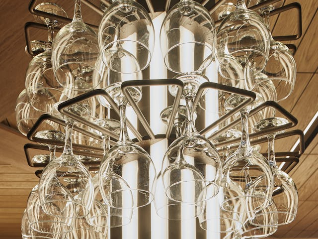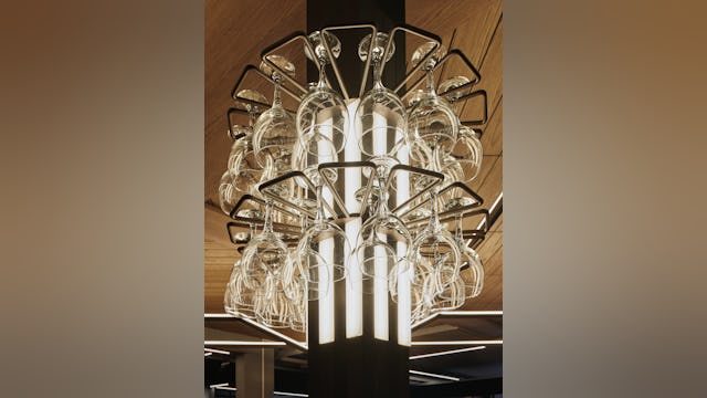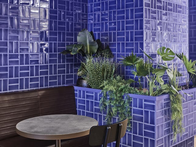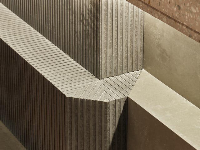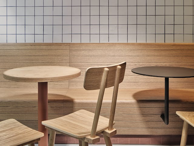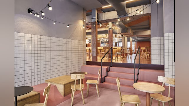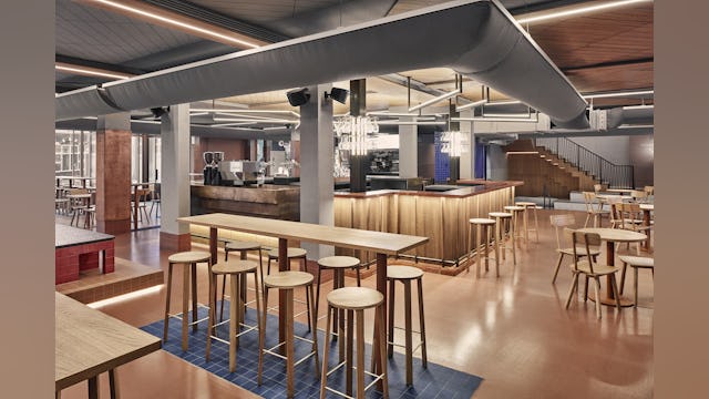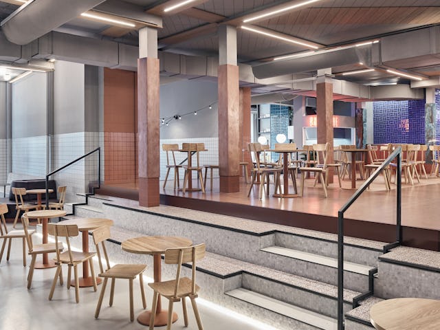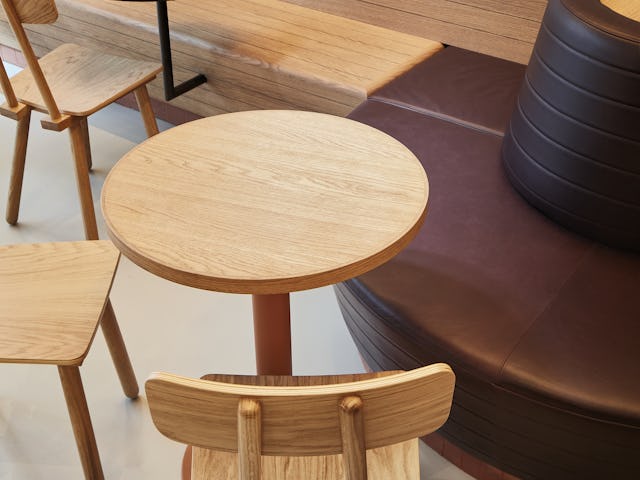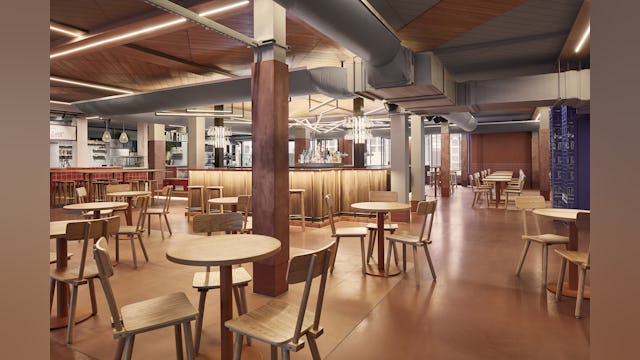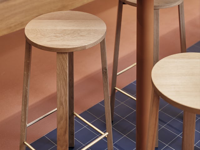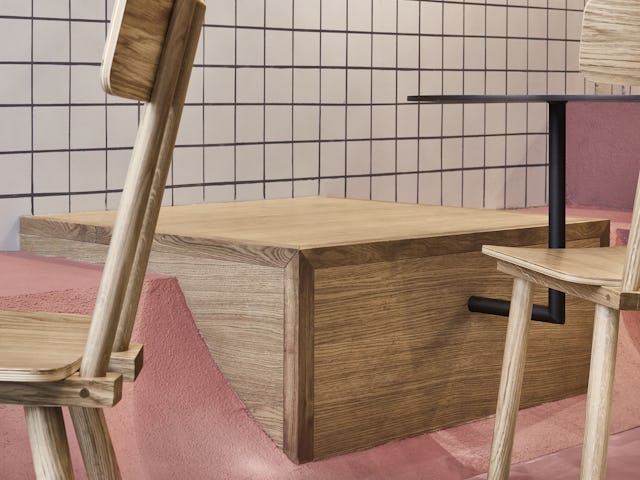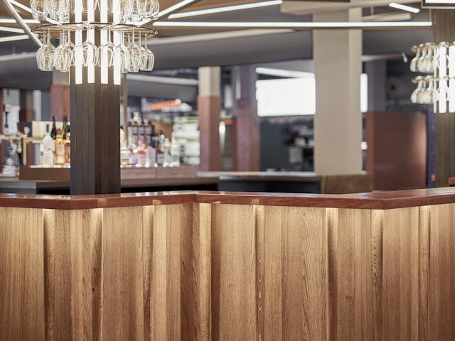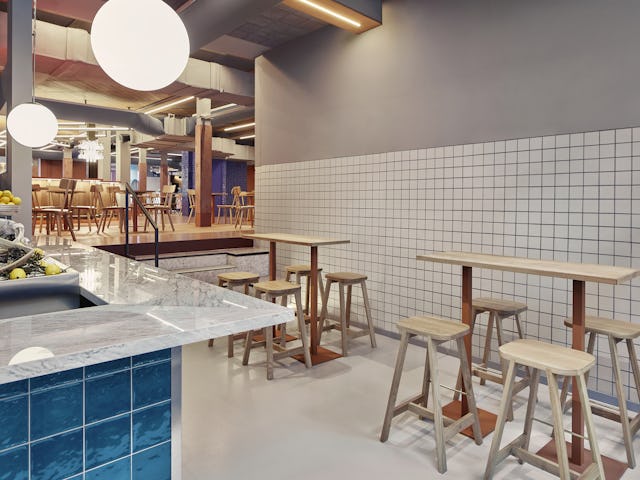 Een centraal geplaatste bar, verdeeld in twee delen, kijkt uit op de ingangen. Een meer intieme cocktailbar bevindt zich aan de andere kant. Beiden zijn afgewerkt met brons, rood marmer en terracotta tegels die overgaan in de vloer en plinten van de kolommen. De kolommen verwijzen naar bestratingspatronen die worden gebruikt op stedelijke pleinen. Verschillende maten en kleuren geven de niveaus van het interieur weer. Op maat gemaakte betegelde banken lijken uit de grond geëxtrudeerd en vormen vaste zitplaatsen.