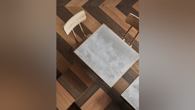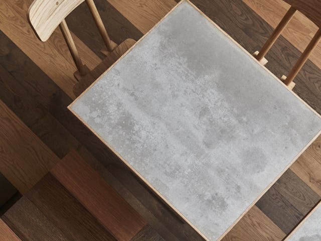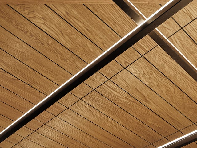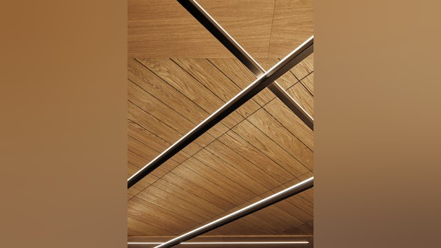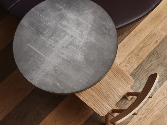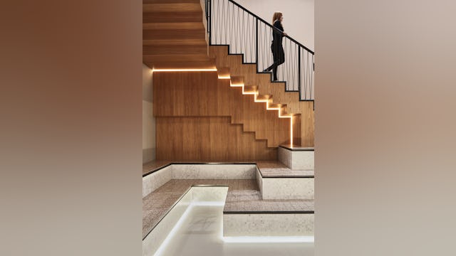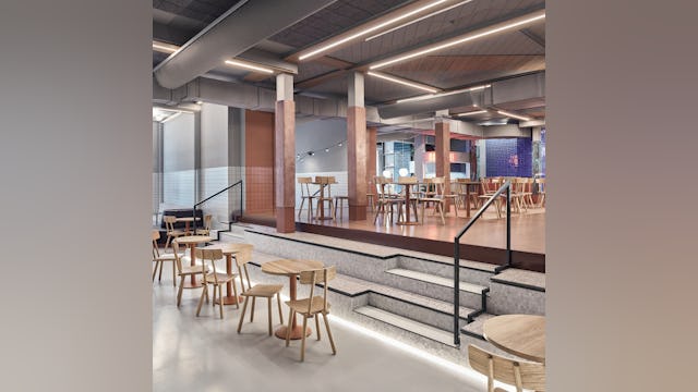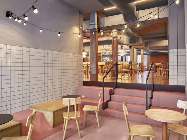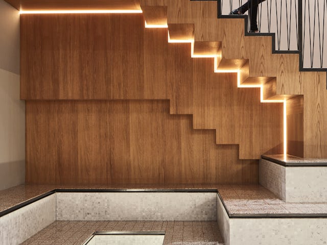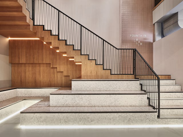 Een grote, op maat gemaakte houten trap naar de bar op de bovenverdieping biedt een andere sociale plek voor mensen om samen te komen. Sterke verticale lijnen maken de ruimte optisch groter. De vloer is gemaakt van houten planken die een geometrisch patroon vormen en opnieuw versmelten tot verhoogde aangepaste zitelementen.