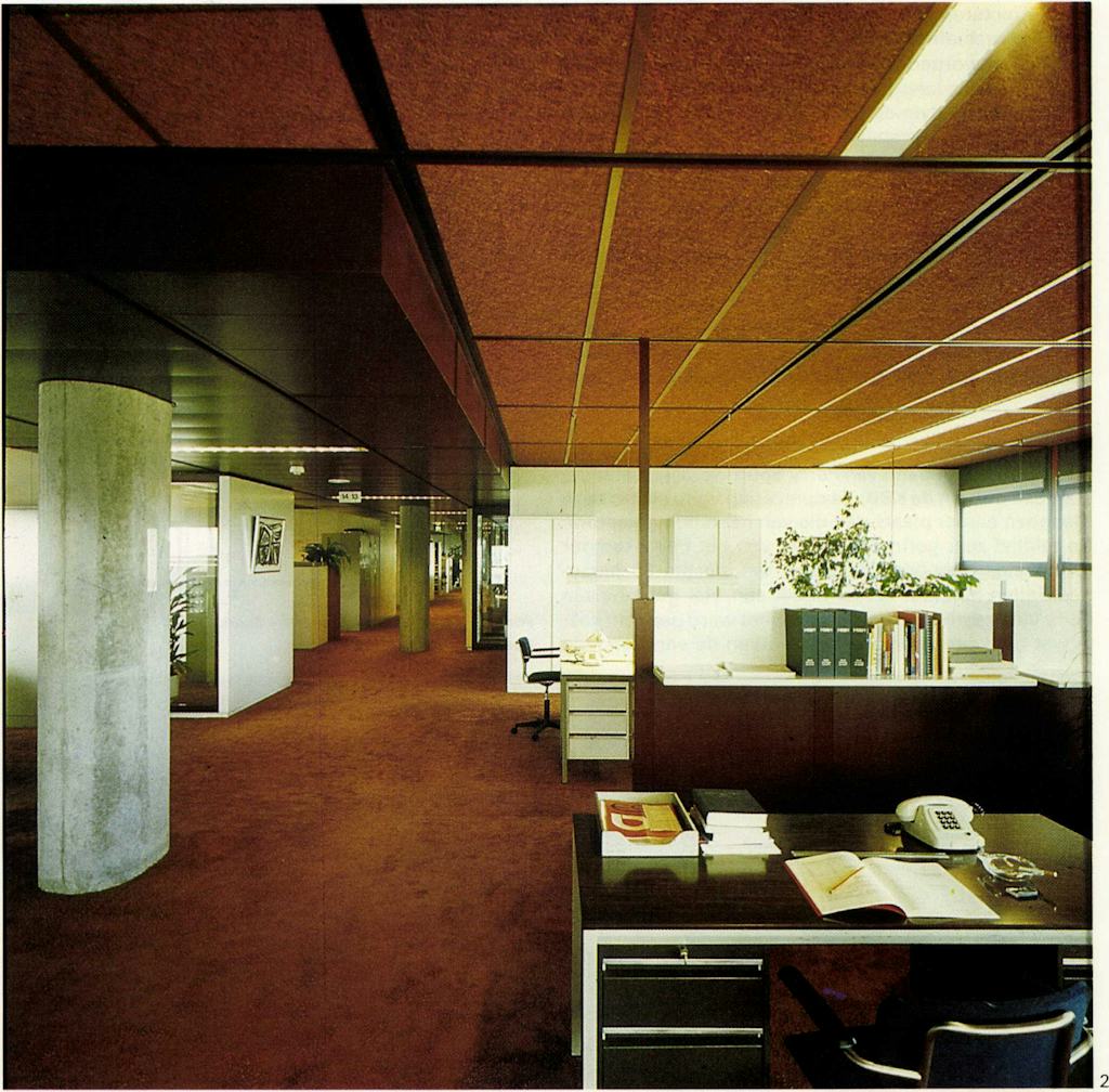 Omdat er nergens een ganggebied over meer dan twee kolomafstanden rechtuit loopt werden overal vierlingkolommen toegepast. Deze vierling kolommen werden ook structuur- en maatbepalend voor de open en dichte kantoorruimten. Om het principe van de vrijstaande kolommen zo goed mogelijk te kunnen handhaven werden de systeemwanden er visueel 'naast geplaatst' maar er in werkelijkheid wel mee verbonden door onder een hoek van 45° geplaatste verticale glasstroken. Om de structureIe indeling te accentueren werd het donkerrode plafond ter plekke van de vierlingkolommen wit geschilderd. Deze witte vlakken zouden weer ondersteund worden door baffles van textiel en een kruisvormig verlichtingsarmatuur tussen de vier staanders, ware het niet dat het budget zelfs hiervoor te kort schoot.