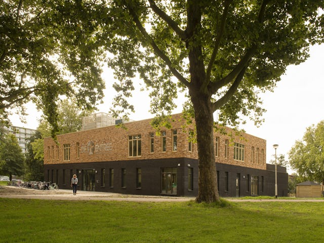 Kindcentrum De Entree ligt ingebed als een paviljoen in een park tussen heuvels en bomen. Het onderwijsgebouw heeft twee bouwlagen met een donkere metselwerk plint en een gemengde beige/bruine eerste verdieping. De verdieping is kleiner dan de begane grond waardoor een dakterras kon worden gemaakt met een brede trap naar het speelterrein in het park. De brede trap werkt als tribune en ‘apenrots’.