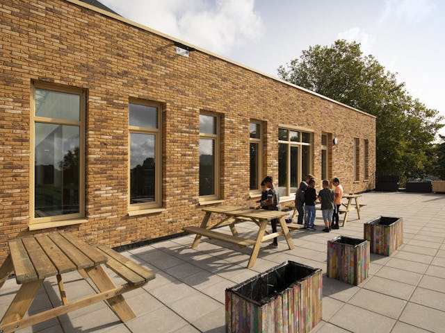 Hier vind je de leerateliers en open samenwerkplekken. De ‘ontmoetingskeuken’ is letterlijk en figuurlijk de centrale plek in het gebouw. Ouders en kinderen komen hier samen om te koken. Het schoolgebouw voorziet de kinderen en medewerkers in flink wat ruimte dat veel vrijheid biedt voor de gewenste flexibiliteit in onderwijsvormen. De vide en een riante lichtstraat zorgen voor veel daglicht dat tot diep in het gebouw doordringt.