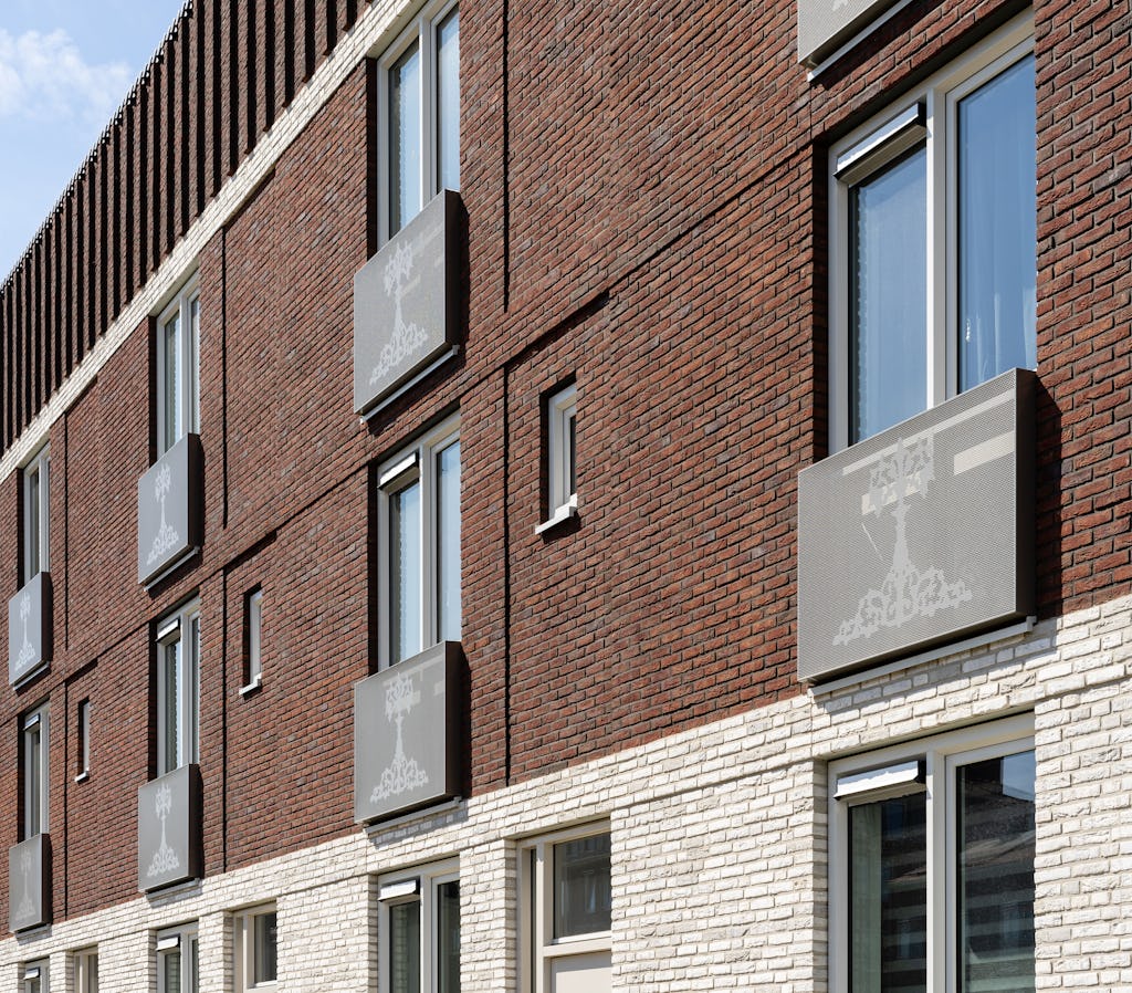 Toelichting opZoom architecten - Bij elk type hebben we binnen het ontwerpteam gezocht naar de bijpassende en specifieke plattegrond. Alle woningen hebben hun voordeur aan deze nieuwe laan. De 14 stadswoningen zijn grondgebonden woningen van ca. 100 m2 GBO in drie bouwlagen met een extra kaplaag. Binnen de stadswoningen is er variatie in het wonen over twee lagen of een meer reguliere plattegrond met aparte woon- en slaapverdieping. Daarnaast heeft opZoom een bijzondere type beneden-bovenwoningen ontworpen. De vier benedenwoningen zijn twee beuken breed. Door deze breedte is het mogelijk om een geheel levensloopbestendig driekamerwoning te realiseren. Minder vitale en rolstoelafhankelijke bewoners kunnen hier lang zelfstandig wonen. De acht bovenwoningen met voordeur aan de straat hebben de woonvloer op de 1e verdieping. Door het centraal plaatsen van de keuken en al het sanitair blijven de gevels vrij en is er veel licht en zicht. Aan de tuinzijde vormt een balkon de buitenruimte en aan de Ruimzichtlaan zit een groot ‘oog’.