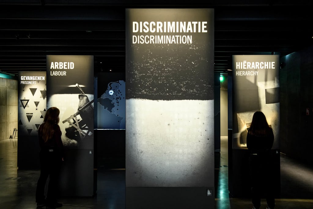 Deze legt ook de relatie naar onrecht vandaag de dag. De achterzijde van de zuilen benoemen belangrijke kampthema’s zoals honger, mishandeling en discriminatie; onderwerpen die nog steeds voorkomen. Daarnaast confronteert een sociaal psychologisch experiment bezoekers met ongemakkelijke dilemma’s. Ze ervaren daar de effecten van groepsdruk, autoriteit en vertrouwen.
