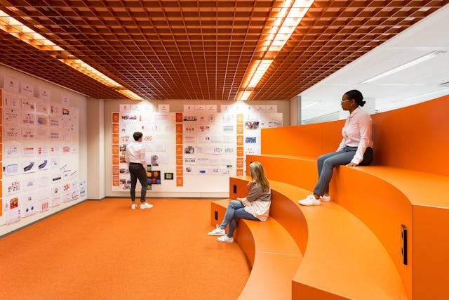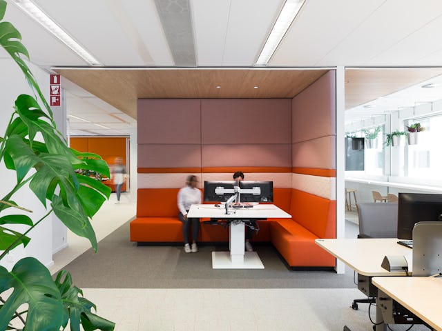 Stand-up ruimtes en tribuneruimtes worden gebruikt voor de dagstart, (korte) presentaties, demo's en dagelijkse stand-ups. Er zijn speciale ruimtes voor brainstormen. Aanlandplekken zijn ruime tafels voor een combinatie van individueel werken en samenwerken. In deze open zone is de akoestiek excellent door de stoffen wanden. In de rustige zone bevinden zich de concentratieplekken.