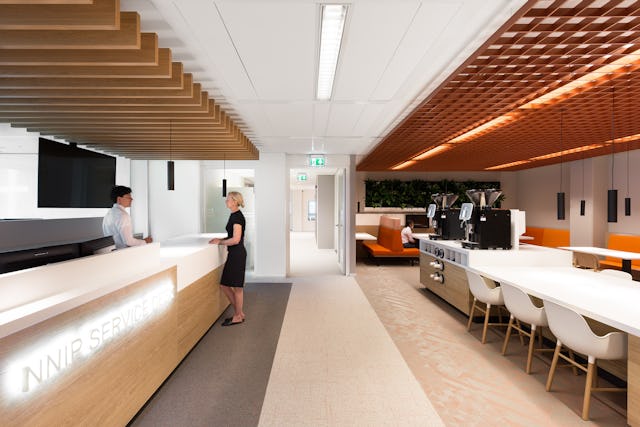 Ontmoeten en samenwerken begint al in de koffiecorners. Een mooie houten stamtafel met goede koffie vormt de ruimte. In de buurt van de koffiecorners bevinden zich de coupéwerkplekken. Deze zijn perfect geschikt voor individueel werk, samenwerken en kort overleg. Er is ook altijd een geïntegreerd beeldscherm waarop je eenvoudig de juiste informatie met je collega’s kunt delen. De kantoren van Nationale Nederlanden hebben ook altijd sport- en ontspanningsruimtes.