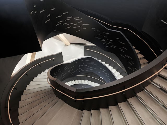 De contrasterende ruimtes die elkaar aanvullen worden gecreëerd door een gebogen houten volume. De ruimtes binnen het volume zijn ingesloten en intiemer. Het houten volume wordt verticaal uitgerekt om verbindingen te creëren met de open hoofdlagen onder en boven.