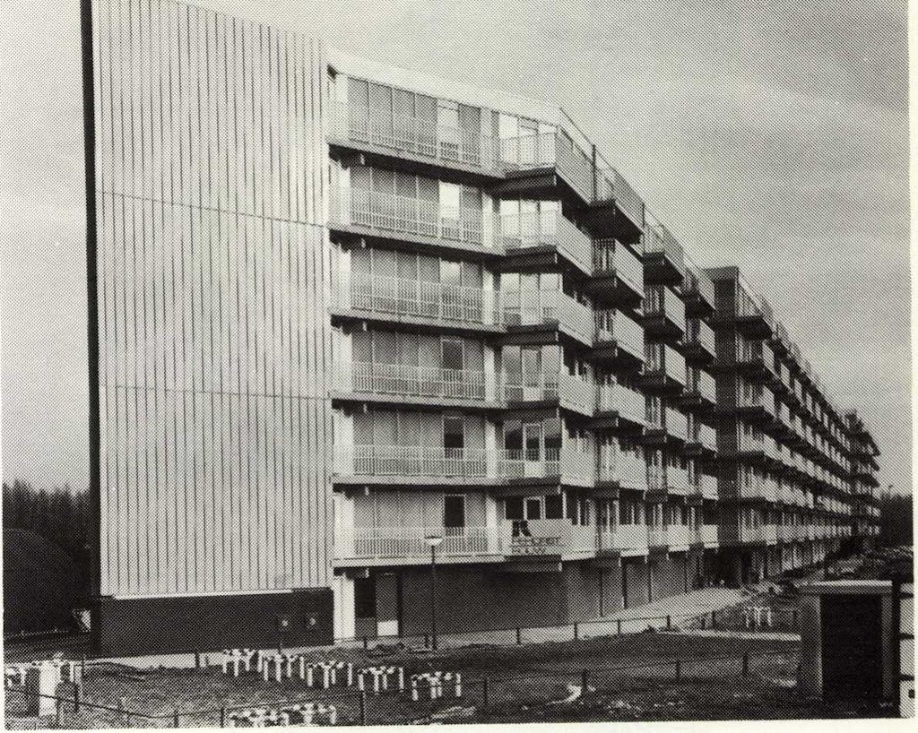 De bouwlocatie heeft een tweetal uitgesproken kenmerken. De vorm ervan is 200 m lang, terwijl de bebouwingsdiepte uiterst gering is. Daarnaast is de oriëntatie van deze strook pal noord-zuid, met als bijzonderheid de drukke verkeersweg aan de noordzijde. Er is voor gekozen deze nogal extreme condities in het ontwerp te versterken: het gebouw ontpopt zich als een geluidswal. Het gebouw telt 123 woningen, verdeeld over zeven lagen, waarvan het merendeel uit drie- en vierkamer appartementen bestaat. De vertrekken voor het wonen en het slapen zijn zoveel mogelijk aan de geluidsluwe zijde geprojecteerd. Bij de driekamerwoning is dit volledig gelukt. Deze woning strekt zich uit in de breedte over twee traveeën van elk 5.10 m. De noordzijde kan nu ruimte bieden aan een gesloten galerij. Zo ontstaan er twee totaal verschillende gevels. Een gladde, ondoordringbare noordgevel en een uit reeksen balkons opgebouwde zuid-gevel.