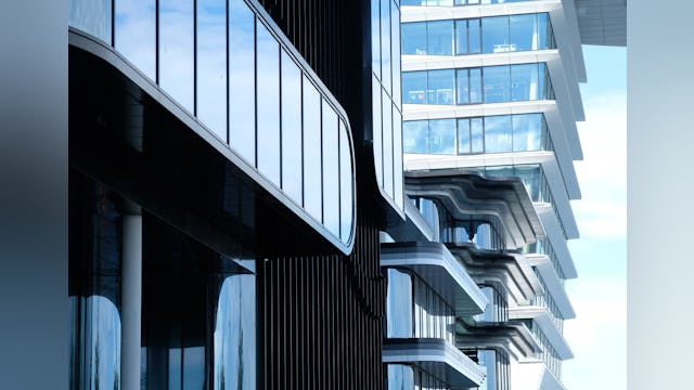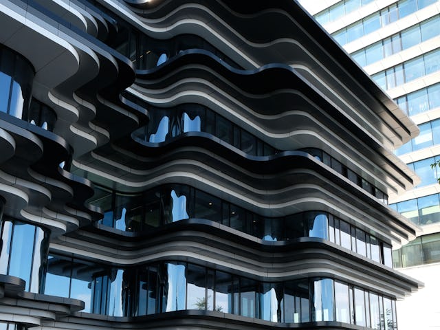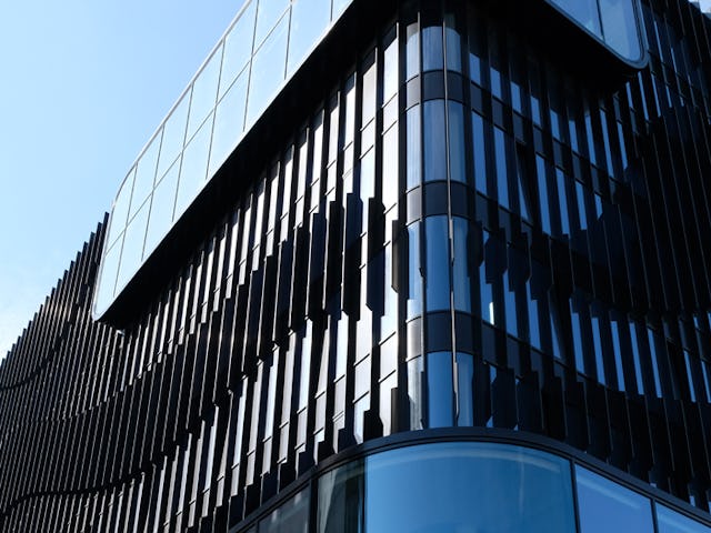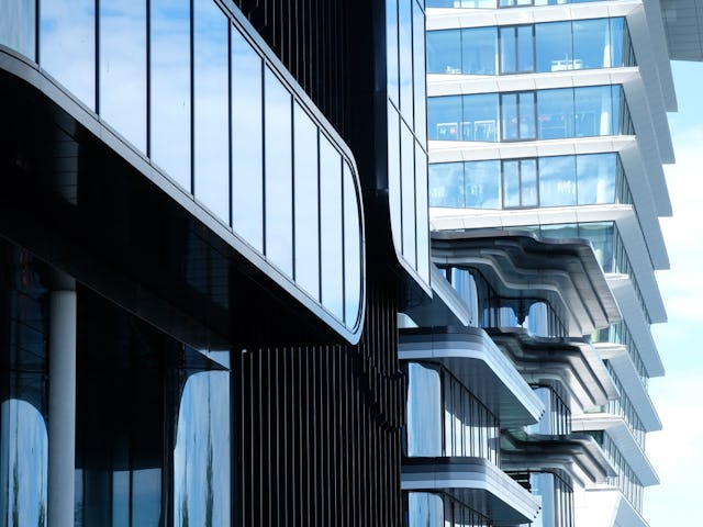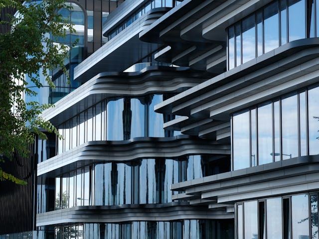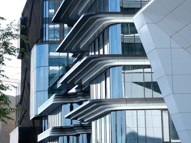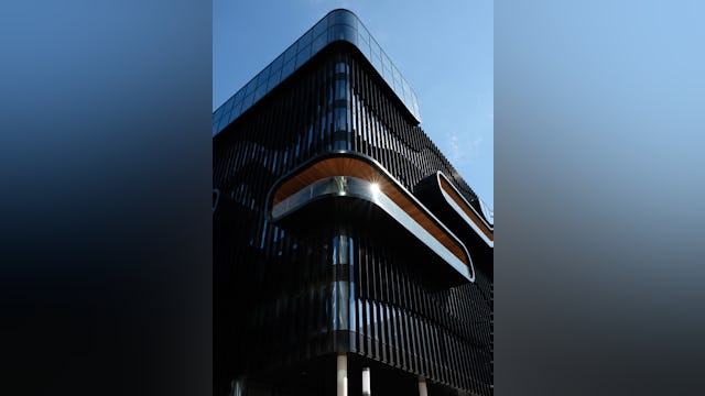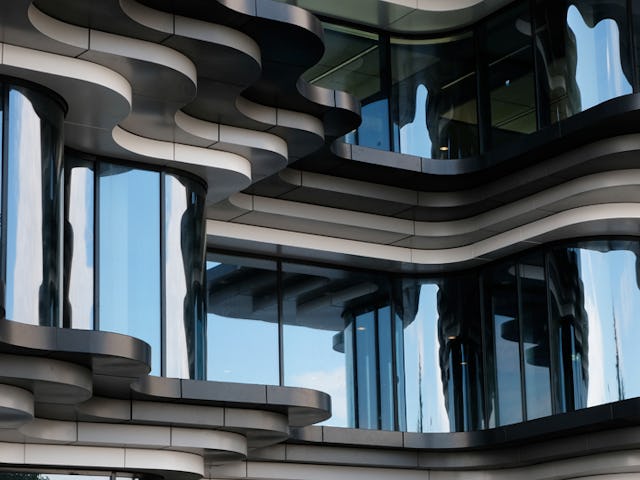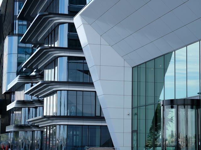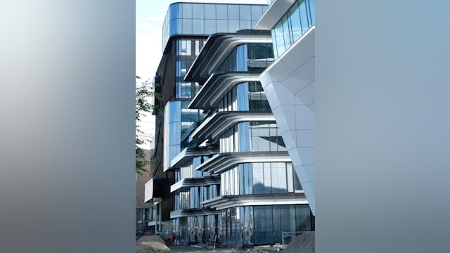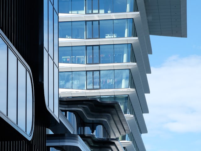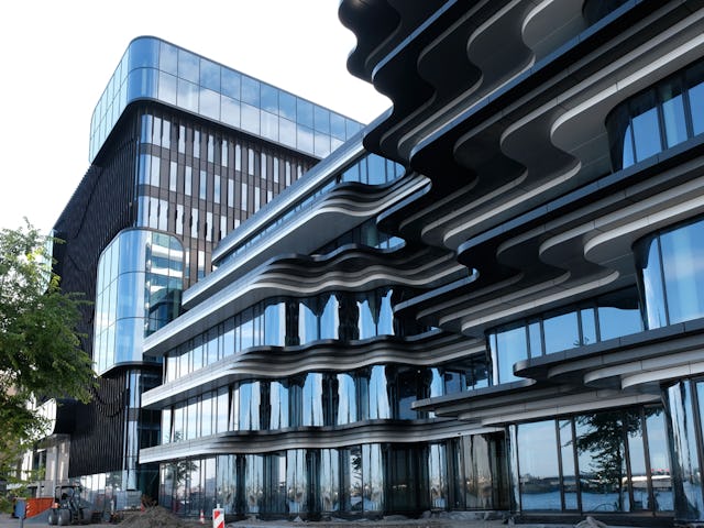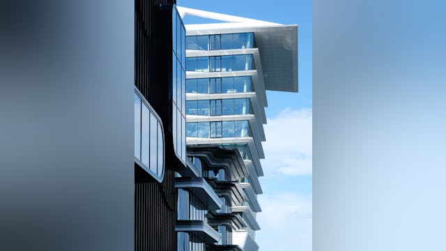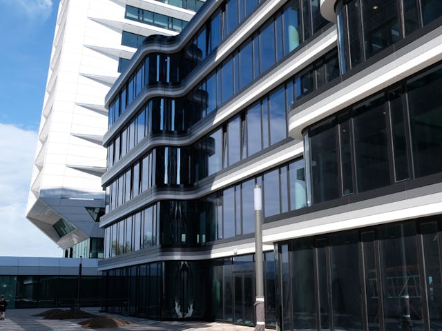 Voor het derde gebouw kozen we vanwege het evenwicht weer voor hoogbouw. Deze tien verdiepingen tellende constructie is gebaseerd op een futuristische visie, met enorme asymmetrische openingen en uit het pand stekende glazen ruimtes met uitzicht op het IJ en de stad. Door deze openingen op de rand van het gebouw te plaatsen zorgden we ervoor dat het grafische element van de gevel, waarbij sculpturale lamellen de golfbewegingen belichamen, centraal kwam te staan.