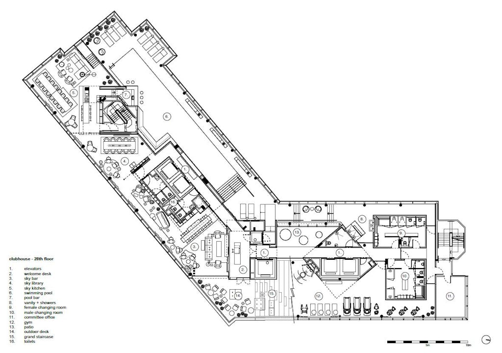 De ruimtes in het clubhuis zijn open en transparant en worden slechts gescheiden door glazen wanden en schuifdeuren. In de lange vleugel liggen een keuken, bibliotheek en bar aan de oostzijde en een zwembad aan de westzijde. De korte vleugel beschikt over een fitness en een salon. Op het scharnierpunt van de vleugels ligt een buitendeck, dat middels een tribunetrap toegang biedt tot het dakpark. Deze trap wordt tevens gebruikt als buitenbioscoop.