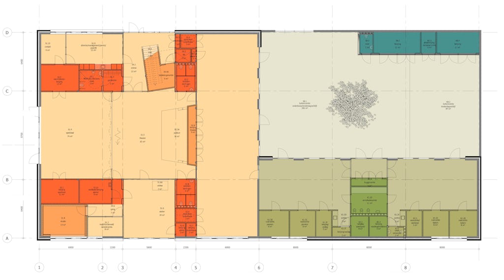 In plaats van klaslokalen is de school opgebouwd uit grotere domeinen. Deze langgerekte ruimten bieden mogelijkheden voor divers gebruik. Daarnaast hebben verschillende specifieke functies een eigen plek gekregen. Zo beschikt de school onder meer over een theater, atelier, restaurant, studio en laboratorium. Ook de ruimten voor het kinderdagverblijf vallen binnen het volume en zijn verbonden met de school en de patio.