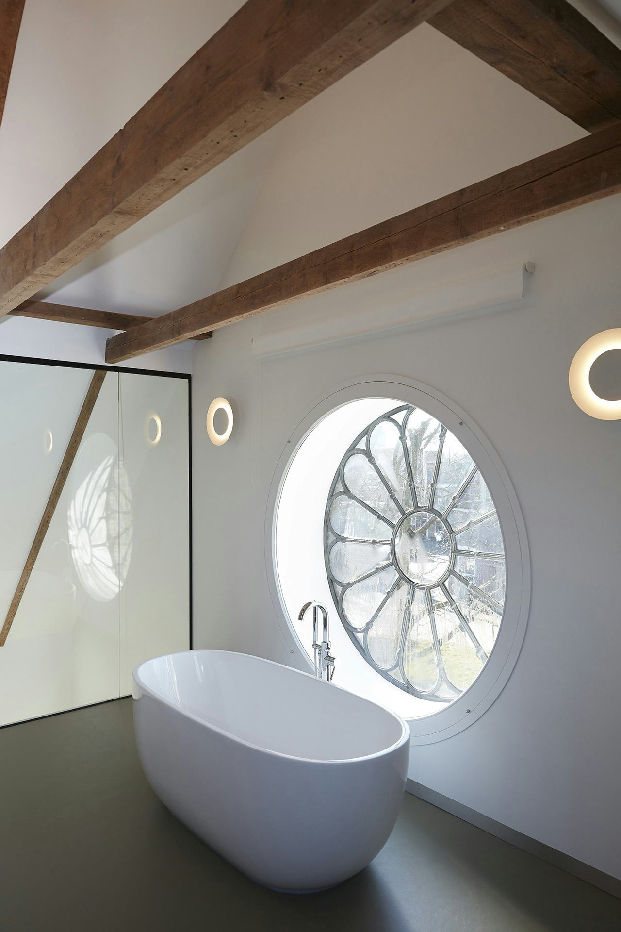 Om deze kerk in een woning te veranderen hebben we een 'doos' in de kerk geplaatst. Deze doos herbergt alle ondersteunende en besloten functies van de woning, terwijl de ruimtelijkheid van de kerk behouden blijft. Door de doos tegen het naastgelegen gebouw te schuiven, konden we gebruik maken van natuurlijke ventilatie en daglicht voor de slaapkamers. De doos is zo ontworpen dat de verkeersruimten van de woning ook een functie hebben - werkplekken en opslagruimte bijvoorbeeld. We hebben de routing en trappen zo ontworpen dat zij een 'architecturale route' creëren die je door de kerk leidt en een steeds veranderend perspectief op de tuinen en de kerk biedt. De route eindigt op de tweede verdieping in de badkamer. Hier zit het prachtig geplaatste bad vlak voor het roosvenster van de gevel van het gebouw. Door de achter- en zijgevel op verschillende plaatsen te openen met de toevoeging van glas, ontstaat een sterke link naar de tuinen. Deze glazen vliesgevels zijn bedoeld om een eigentijds element te bieden en hun abstracte vorm is consistent met het ritme van de bestaande kerkramen.