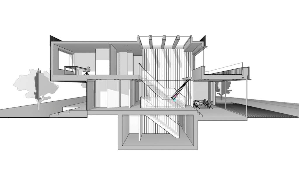 Het huis heeft een eigen energievoorziening in de vorm van aardwarmte en zonnepanelen. Een CO2 gestuurd systeem met warmteterugwinning en LED-verlichting reduceren het energieverbruik. In de noordelijk georiënteerde tuin wordt de zon juist verwelkomt, doordat de verdieping aan de noordzijde is teruggelegd. Een aanlegsteiger aan het water loopt in een lijn door in de centrale as in het interieur, dat zich met een grote pui opent richting de tuin.