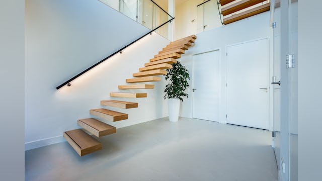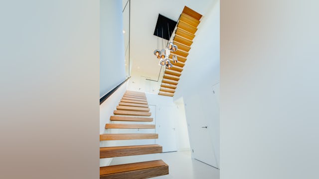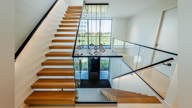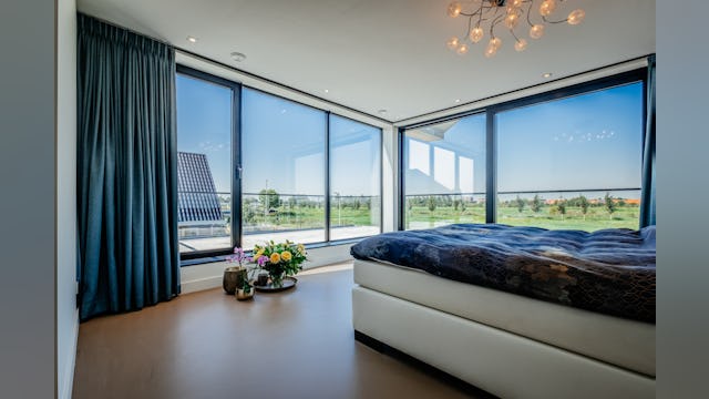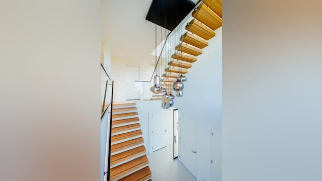 De gehele eerste verdieping wordt ontsloten door een galerij dat aansluit op het open trappenhuis met zwevende tredes. Door het toepassen van een glazen balustrade wordt de ruimtelijkheid en het verbindende karakter van de entree nog meer geaccentueerd. Op de eerste verdieping bevinden zich twee slaapkamers, badkamer en een apart toilet. De volledige rechter vleugel wordt ingenomen door de master bedroom met inloopkast en badkamer. Het prachtige uitzicht kan hier nog meer ervaren worden door het terras dat de gehele hoek van de woning met elkaar verbindt.