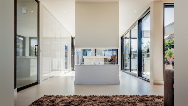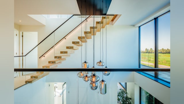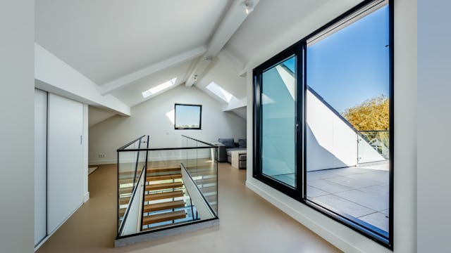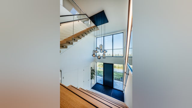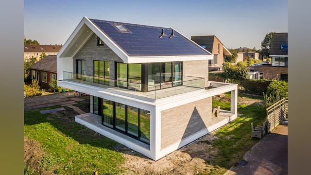 Op de bovenste verdieping bevindt zich het kantoor met een prachtig terras en uitzicht over de weilanden. Het dak is geheel bedekt met geïntegreerde zonnepanelen. Samen met de bodemwarmtepomp krijgt deze woning een EPC van 0.