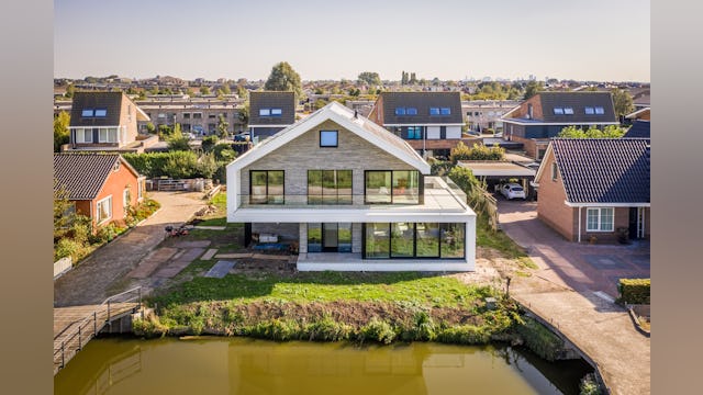 De extra lange metselstenen met verdiepte voeg en zonder lintvoeg zorgt voor extra horizontaliteit. De grijze kleur van de bakstenen zorgt, in combinatie met het witte stucwerk, het vele glas en de zwart matte kozijnen dat deze moderne, duurzame villa een warme uitstraling heeft.