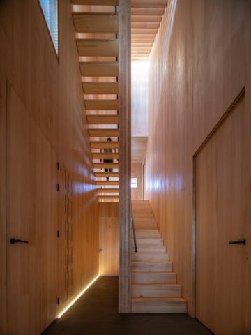 De twee lagere volumes hebben de vorm van typische puntschuren die rechtstreeks zijn verbonden met de omliggende tuinen. Het hogere volume vangt het zicht op het brede landschap en vormt een opvallend contrast met de lagere gebouwen. Het hoogste element, het meest prominente gebouw, bevat de hoofdslaapkamer op de begane grond, kinderkamers op de bovenste verdiepingen en een dakterras aan de bovenkant. Van de twee schuren is er een ingericht als woonkamer, keuken met eethoek en een grote veranda aan de zuidwestkant, met een werkruimte en een speelkamer op de eerste verdieping.
