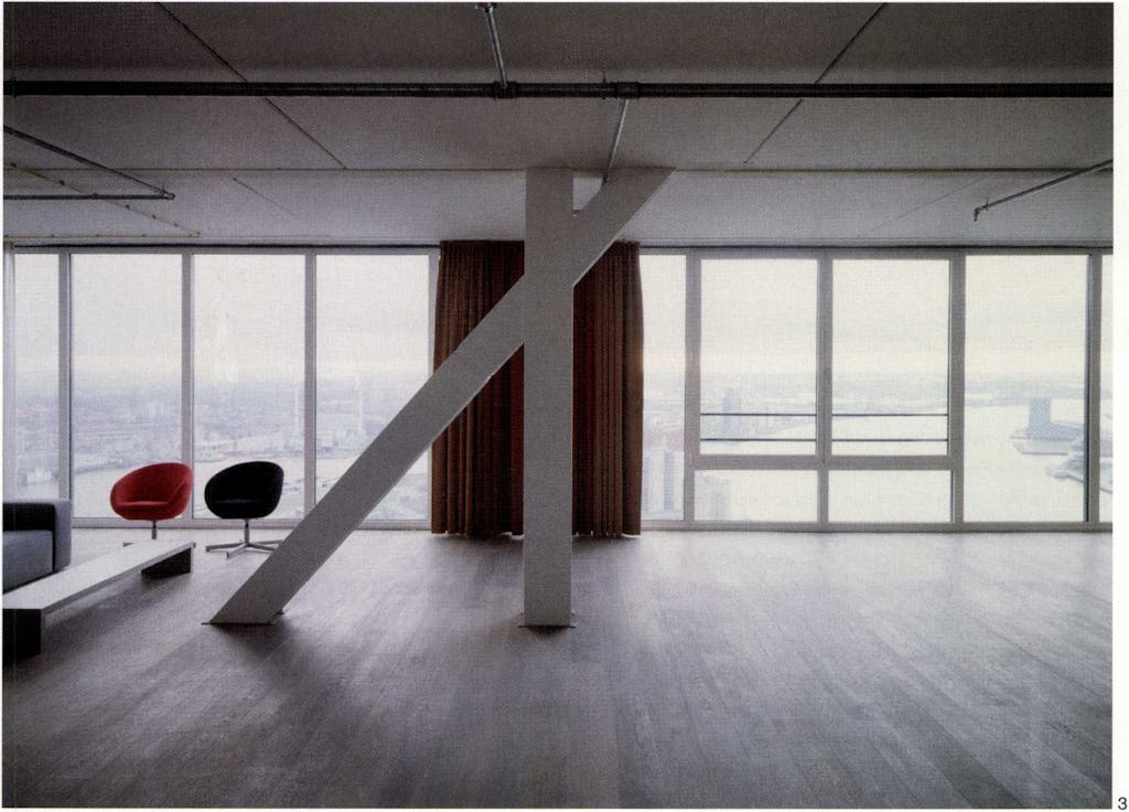 Dat uitgekiende fragmentarische karakter slaat goed aan bij de interne structuur van Montevideo. Hoewel het voornamelijk een woongebouw is (de kantoren lijken bijzaak), is er een groot verschil tussen de dure koopappartementen in de top van het gebouw (de 'skylofts'), die casco worden opgeleverd als open volumes, de andere koopappartementen en de verschillende luxueuze flats voor de huurmarkt. Mecanoo heeft veel ervaring in het maken van woongebouwen en heeft uit de door haar ontwikkelde typologieën geput om hier een keur aan efficiënt ingedeelde ruimtes te ontwerpen. Maar veel meer is er niet: de karige entree, het zwembad en alle gezamenlijke voorzieningen zijn voorzien van alles wat je tegenwoordig van wonen op stand in een gebouw kan verwachten, maar binnen de ijzeren (of liever gezegd, stalen en betonnen) logica van deze hoogbouw was blijkbaar geen plaats voor enige ruimtelijke werking.