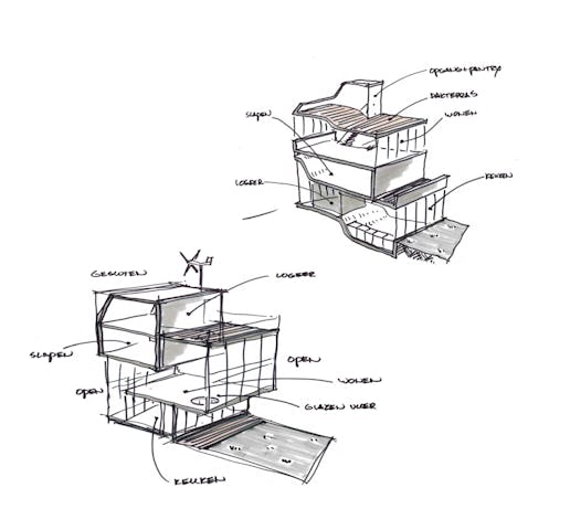 De kavel heeft een verdraaiing, en de woning benut deze door de gevels op de begane grond recht te leggen. Zo ontstaan aan straat-en tuinzijde overstekken. De keuken, op de begane grond, heeft hiermee een beter doorzicht. Er is ruimte aan de straat en Delftse stoep voor het stallen van fietsen, en aan de tuinzijde is er ruimte voor een terras met beschutting. Het overstek aan de voorzijde kan worden afgesloten met schuivende panelen, hierdoor is de interactie met de straat te beïnvloeden.
