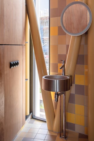 Via open trappen wordt de meer private slaapverdieping bereikt die als gesloten kap is ontworpen. De bamboe afwerking hiervan vormt één geheel met het bovenliggende terras. Het terras wordt ontsloten door een dakopbouw met pantryvoorziening en pv-cellen in het dak. Een belangrijke drager in het ontwerp is de op iedere verdieping aanwezige kastenwand. De met divers plaatmateriaal afgewerkte kast biedt naast veel bergruimte ook plaatst aan de installaties.