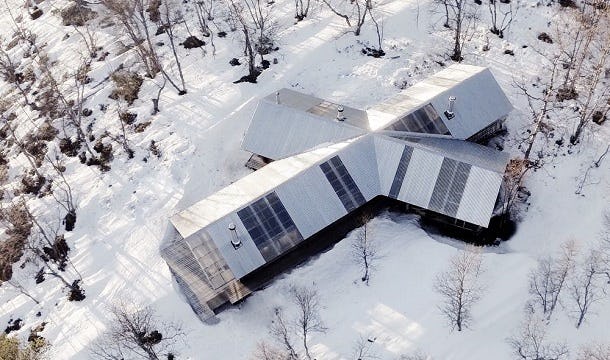De Noorse Architect Aslak Haanshuus heeft met een slim geplaatst volume twee bestaande blokhutten uitgebreid. Aan de rand van het Noorse meer Femunden stond reeds een honderd jaar oude hut. Onder een kleine hoek is hier later volgens dezelfde traditionele bouwwijze een naast geplaatst. De nieuwste uitbreiding bouwt hierop voort met twee onderling verbonden vleugels in het verlengde van de bestaande hutten.