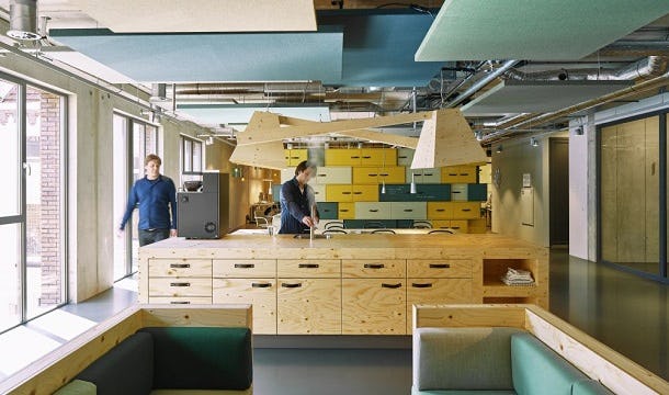 In het nieuwe hoofdkantoor van Woonbedrijf zijn vier voormalige locaties onder één dak gebracht. Het is volledig ingericht op flexwerken, niemand nog een eigen werkplek. Voor de inrichting inventariseerde Van Eijk en Van der Lubbe alle functies van het gebouw en de intensiteit van het gebruik. Op basis van grondtekeningen van architect Bert Spierings ontwierp het bureau een interieur dat op elke verdieping berekend is op alle denkbare activiteiten.