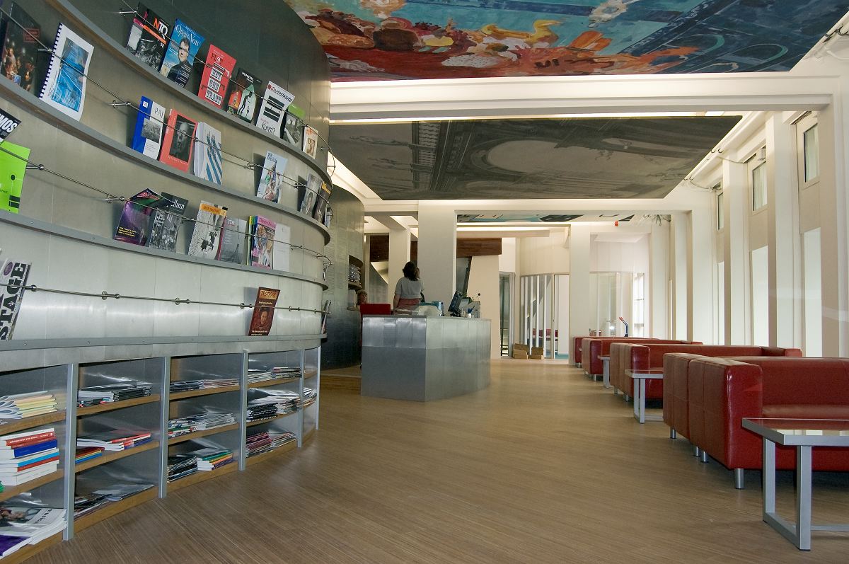Een half open, afgerond plafond van houten latten is de blikvanger van het interieur van de Espressofabriek in Amsterdam-IJburg. Net als de eerste vestiging van deze koffiebar, die zich op het Westergasfabriekterrein bevindt, is ook dit interieur ontworpen door Ramin Visch.