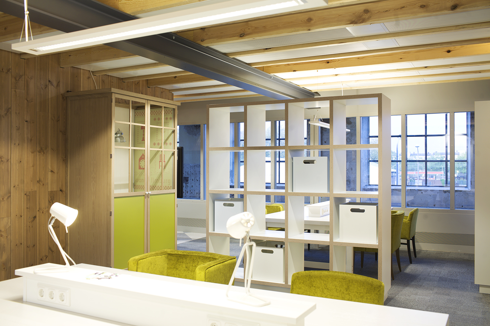 Woningcorporatie Wonen Limburg wilde een 'thuisvestingsconcept' voor het nieuwe hoofdkantoor en zes buurtwinkels in de regio. Studiomfd creëerde een ruimtelijke, functionele indeling op basis van een woonhuis. Een leefkeuken om in te eten en te praten met elkaar. Een woonkamer voor ontmoetingen en ontspannen werken. Een studeerkamer voor werkactiviteiten in alle rust.