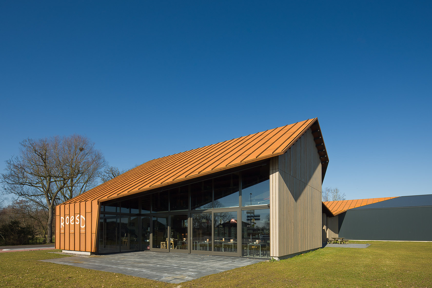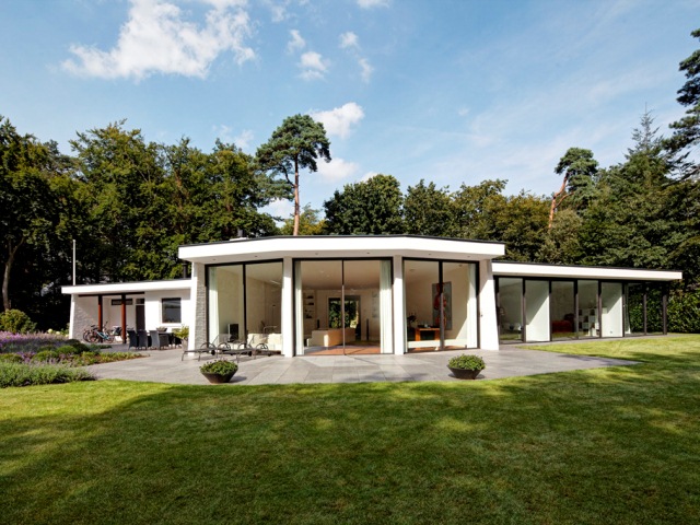 Deze woning in Hilversum geeft een ongewone indruk. Het veelhoekige centrale woongedeelte wordt geflankeerd door twee lagere vleugels. Recent lieten de bewoners de villa, daterend van eind jaren vijftig, renoveren en aan de tuinzijde uitbreiden en voorzien van verdiepingshoge glazen puien.