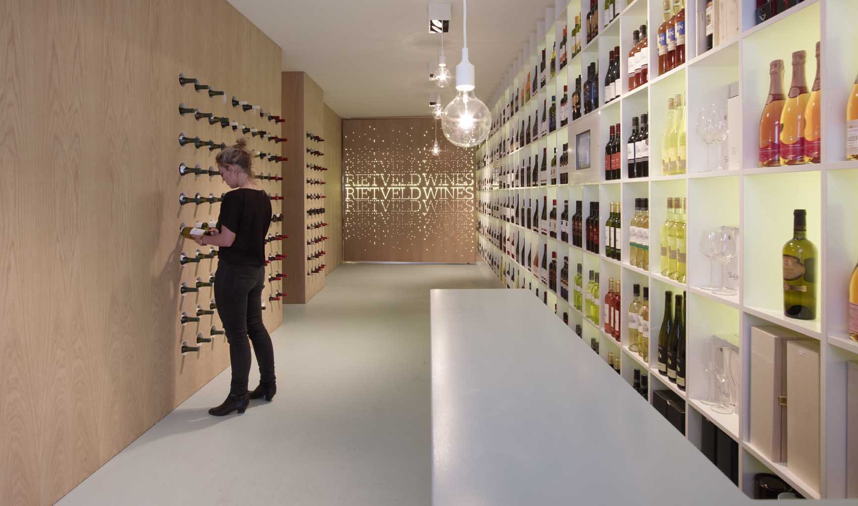 "Rietveld Wines is een wijnwinkel met proeflokaal. Een uitgestrekte witte kastenwand aan de rechterkant en een lange eikenhouten wand daartegenover, beide vol flessen, maken in één oogopslag duidelijk wat er in de winkel verkocht wordt.