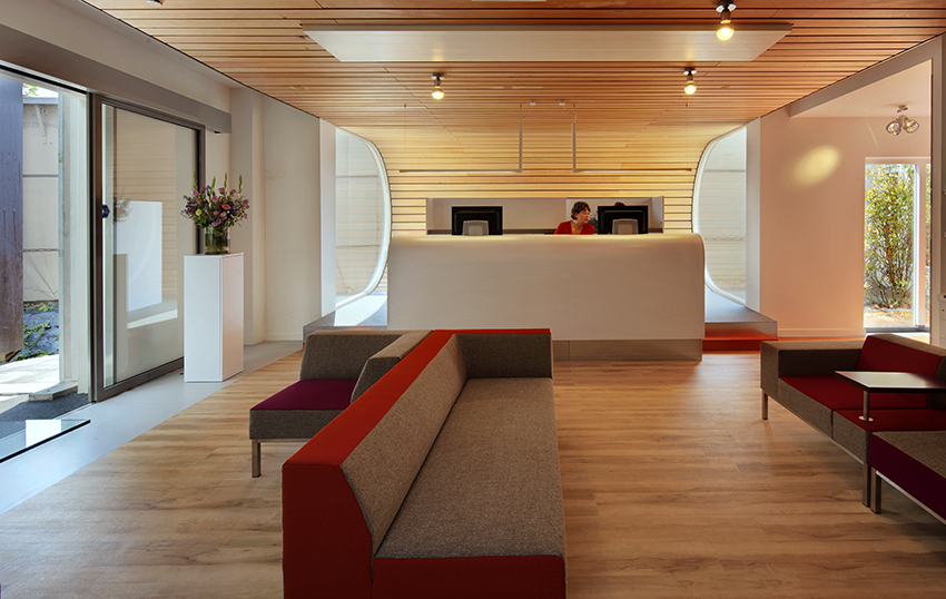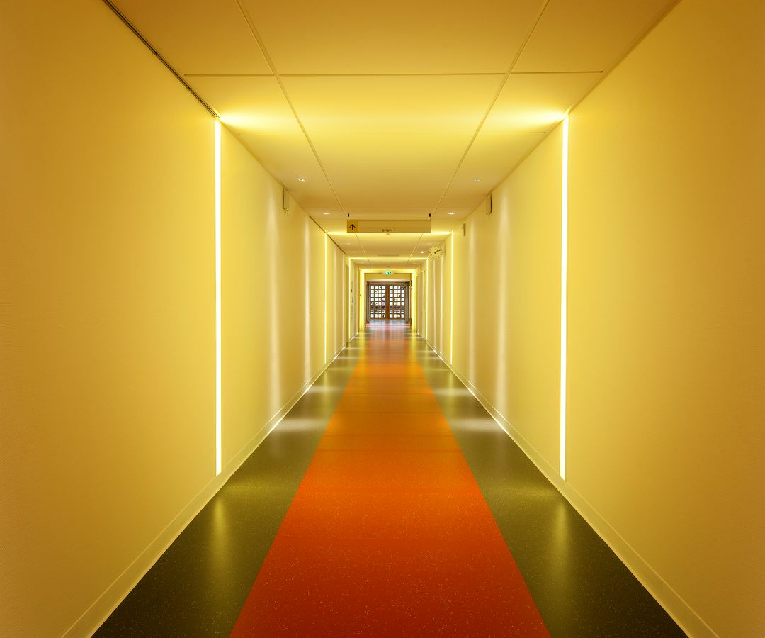 Het interieur dat Fokkema & Partners ontwierp voor het nieuwe Europese hoofdkantoor van het sportschoenenmerk ASICS, is vriendelijk, bescheiden en puur. Dat begint al bij de receptie, waar bezoekers voor het eerst kennismaken met het grafisch ontwerp dat refereert aan de zolen van de sportschoenen. Dit honingraatpatroon keert in het gebouw terug op diverse manieren.