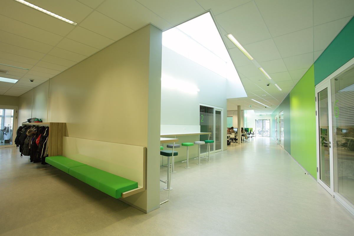 Een 11-klassige basisschool van totaal 1785 m2 is voor een bestaande gymzaal 850 m2 geplaatst die gerenoveerd is.