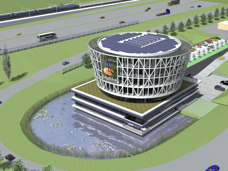In het ontwerp voor de Rabobank GHN is sterk de nadruk gelegd op een combinatie van het concept locatie,duurzaamheid en flexibiliteit Het gebouw is onmiskenbaar een landmark aan de snelweg A4.en een poort naar de gemeente Kaag en Braassem.