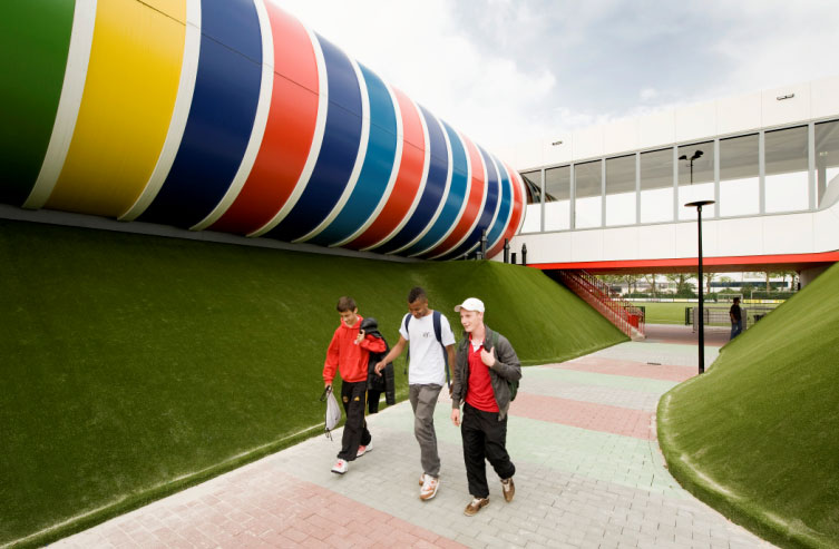 Voor de Eindhovense wijk Strijp heeft LIAG architecten en bouwadviseurs een duurzaam en uitnodigend sportcomplex ontworpen. De sportaccommodatie is geïntegreerd in het terrein door het deels 'in te pakken' in een groene - aaibare - heuvel.