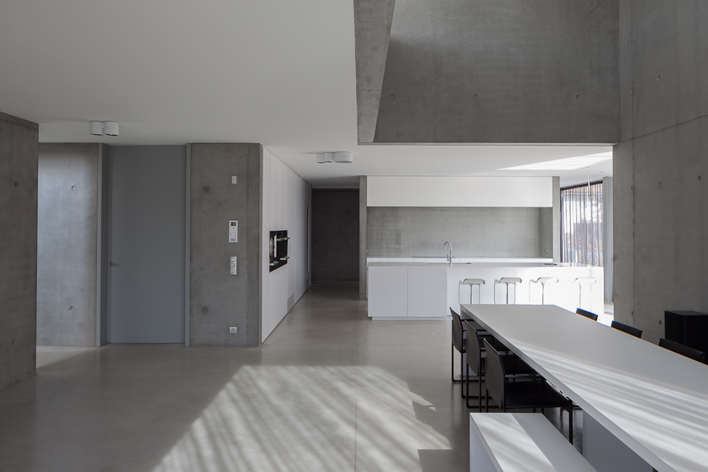 Dit huis in Waregem bestaat uit een architectenbureau met gezinswoning voor de projectarchitect Ellen Vertommen. Het voorkomen van de woning is volledig bepaald door het feit dat de constructie is uitgevoerd in ter plaatste gestort, zelfnivellerend beton. Zowel binnen als buiten is het materiaal zichtbaar gebleven zonder afwerking.