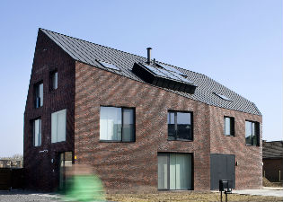 Het Antwerpse bureau RADAR ontwierp een volume waarin drie programmaonderdelen van twee laag-energie woningen op intelligente wijze in elkaar werden gepuzzeld. Zo zijn ze evenwichtig over de beide bouwpercelen verdeeld. Met de traditionele zadeldaktypologie als uitgangspunt, zijn een aantal beredeneerde afsnijdingen van het volume gedaan die de relatie met de omgeving versterken.