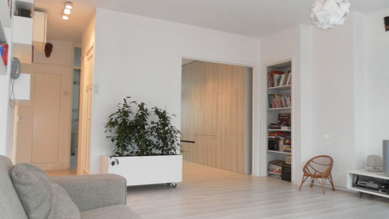Voor een appartement in Rotterdam is een nieuwe indeling en afwerking ontworpen. Het ontwerp resulteert in een meer open indeling, waarbij de ruimte efficiënter benut wordt. Een belangrijk onderdeel van het ontwerp is een multifunctionele kastenwand, met daarin onder andere een bureaublad en een bed.
